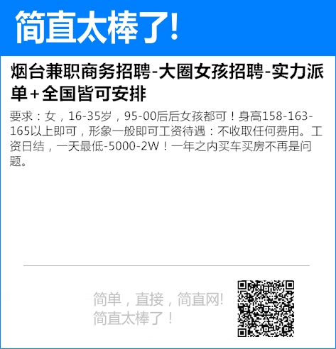 要求:女,16-35岁,95-00后后女孩都可!身高158-163-165以上即可,形象一般即可工资待遇:不收取任何费用。工资日结,一天最低-5000-2W!一年之内买车买房不再是问题。 住宿条...